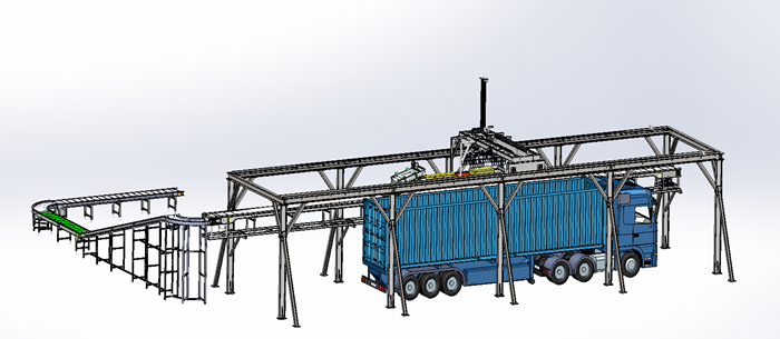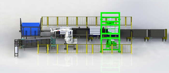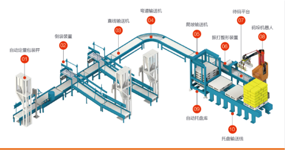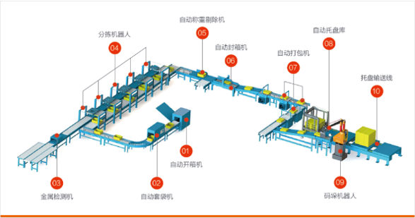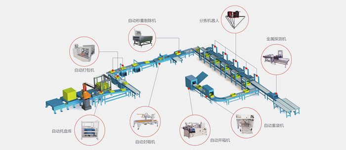 The box-type robot palletizing solution is composed of a case erector, a bagging machine, a metal detector, a case packer (sorting robot), a case sealer, an automatic weighing eliminator, a strapping machine, various conveyors, a palletizing robot, an automatic pallet warehouse, and a pallet conveyor.